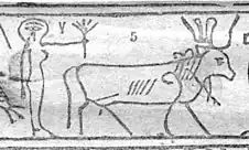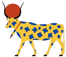 A cow, representing Hathor, the heavenly cow.[13] Behind is a standing female figure with the Eye of Horus depicted on her head and holding out a water lily in her left hand.[13]