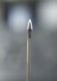 Hypodermic needles are normally made from a stainless-steel or Niobium tube[18] through a process known as tube drawing where the tube is drawn through progressively smaller dies to make the needle. The end of the needle is bevelled to create a sharp pointed tip, letting the needle easily penetrate the skin.[19]