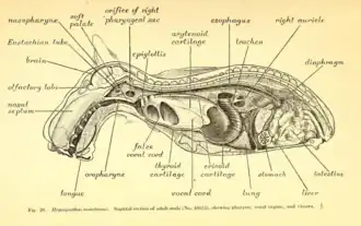 Internal organs as viewed from the side. Note the extent of the laryngeal structure (vocal folds).