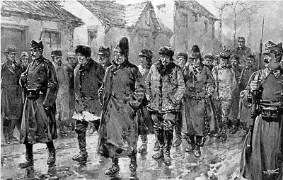 Vissarion's life became more violent with his taking part in the peasants' revolt of March 1907. As noted by critic Ion Roman, in his series of poems, retaken by Gazeta Țăranilor between 1906 and February 1907, Vissarion "dared to prophesy, and in some ways even stoke", these revolutionary events.[13] He also expressed this radicalism in a poem he sent to the mainstream daily Universul, which was read by the authorities;[9] Vissarion himself believes that he was detested for his pieces in Hazul Satelor, which, though pseudonymous, were easily attributable to him.[5] An account by eyewitness Stan G. Perșinaru suggests that Vissarion was in fact caught while recruiting thousands of peasants for an attack on Titu train station; Perșinaru also claims to have seen Vissarion captured and escorted by a cavalry guard.[13] Investigators alleged that he had used his talents as a chemist to fabricate homemade bombs.[14] He was subsequently sent to a prison center in Târgoviște,[9][14] where he claims to have been beaten into submission.[13][15]