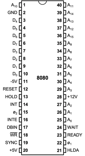 The Intel 8080 ("eighty-eighty") is the second 8-bit microprocessor designed and manufactured by Intel. It first appeared in April 1974 and is an extended and enhanced variant of the earlier 8008 design, although without binary compatibility.[3] The initial specified clock rate or frequency limit was 2 MHz, with common instructions using 4, 5, 7, 10, or 11 cycles. As a result, the processor is able to execute several hundred thousand instructions per second. Two faster variants, the 8080A-1 (sometimes referred to as the 8080B) and 8080A-2, became available later with clock frequency limits of 3.125 MHz and 2.63 MHz respectively.[4] The 8080 needs two support chips to function in most applications: the i8224 clock generator/driver and the i8228 bus controller. It is implemented in N-type metal–oxide–semiconductor logic (NMOS) using non-saturated enhancement mode transistors as loads[5][6] thus demanding a +12 V and a −5 V voltage in addition to the main transistor–transistor logic (TTL) compatible +5 V.
