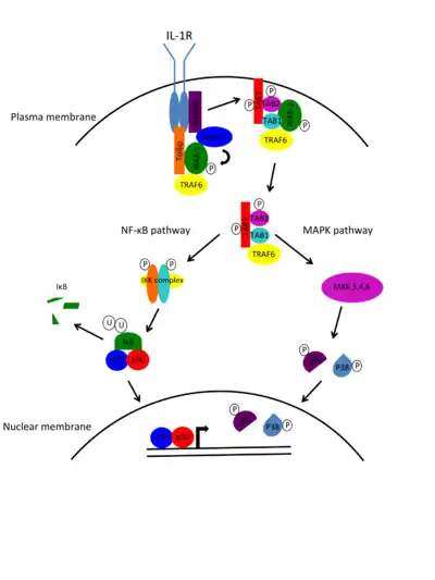 IL-1 binding to IL-1R complex triggers the recruitment of the adaptor molecule MyD88 through interactions with the TIR domain. MyD88 brings IRAK-4 to the receptor complex. Preformed complexes of the adaptor molecule Tollip and IRAK-1 are also recruited to the receptor complex, allowing IRAK-1 to bind MyD88. IRAK-1 binding to MyD88 brings it into close proximity with IRAK-4 so that IRAK-4 can phosphorylate and activate IRAK-1. Once phosphorylated, IRAK-1 recruits the adaptor protein TNF receptor associated factor 6 (TRAF6) and the IRAK-1-TRAF6 complex dissociates from the IL-1R complex. The IRAK-1-TRAF6 complex interacts with a pre-existing complex at the plasma membrane consisting of TGF-β activated kinase 1 (TAK1), and two TAK binding proteins, TAB1 and TAB2. TAK1 is a mitogen-activated protein kinase kinase kinase (MAPKKK). This interaction leads to the phosphorylation of TAB2 and TAK1, which then translocate to the cytosol with TRAF6 and TAB1. IRAK-1 remains at the membrane and is targeted for degradation by ubiquitination. Once the TAK1-TRAF6-TAB1-TAB2 complex is in the cytosol, ubiquitination of TRAF6 in triggers the activation of TAK1 kinase activity. TAK1 can then activate two transcription pathways, the nuclear factor-κB (NF-κB) pathway and the mitogen-activated protein kinase (MAPK) pathway. To activate the NF-κB pathway, TAK1 phosphorylates the IκB kinase (IKK) complex, which subsequently phosphorylates the NF-κB inhibitor, IκB, targeting it for degradation by the proteasome. Once IκB is removed, the NF-κB proteins p65 and p50 are free to translocate into the nucleus and activate transcription of proinflammatory genes. To activate the MAPK pathway, TAK1 phosphorylates MAPK kinase (MKK) 3/4/6, which then phosphorylate members of the MAPK family, c-Jun N-terminal kinase (JNK) and p38. Phosphorylated JNK/p38 can then translocate into the nucleus and phosphorylate and activate transcription factors such as c-Fos and c-Jun.[5]