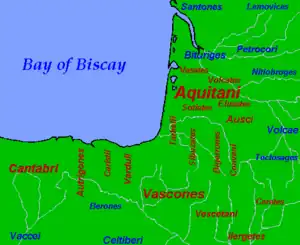 The Aquitanian language was the language of the ancient Aquitani, spoken on both sides of the western Pyrenees in ancient Aquitaine (approximately between the Pyrenees and the Garonne, in the region later known as Gascony) and in the areas south of the Pyrenees in the valleys of the Basque Country before the Roman conquest.[1] It probably survived in Aquitania north of the Pyrenees until the Early Middle Ages.