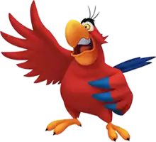 Iago resembles a red lory, with red feathers and blue tipped wings, bluish-purple tail, and white around the eyes. He can speak fluent English and has the ability to perfectly mimic other characters' voices.[10] He also possesses knowledge of various tricks learned from Jafar. He is easily frustrated and openly vocalizes his frustrations, and avoids direct confrontations if he can help it, but when required, he can be quite cunning and mischievous.