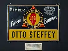 This fence sign once belonged to Otto Steffey, the Illinois Farm Bureau president when IFB headquarters moved from Chicago to Bloomington. The sign was part of a time capsule that was buried after the move and was then unsealed in honor of the IFB's 100th birthday.