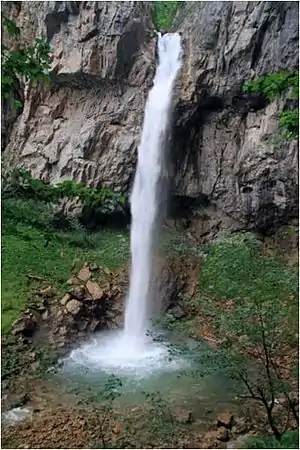 Ilomska waterfalls include Veliki vodopad and Mali vodopad (Great, and Lesser Waterfall). To those, several other waterfalls could be joined in the upper and middle course. Great and Lesser waterfalls are located about 2 km from the mouth of the Ilomska river into the Ugar, in a narrow canyon at the Under-Vlašić-mountain plateau between almost vertical Korićan cliffs Korićanske stijene, and Marići and Đenići villages. Both waterfalls are at the altitude of 750 –780 m above sea level, that is about 350 meters lower than the surrounding imljani – Korićani plateau.[1][2]