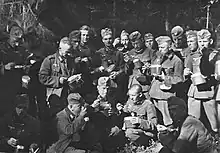 By World War II, rations had taken modern organized forms for both the Allies and the Axis. The U.S. military revised their World War I-era ration organization system into an alphabetized system: A-rations of fresh food, B-rations of packaged unprepared food, C-rations of prepared canned food, D-rations of chocolate, and K-rations of three-course meals.[26] British soldiers were issued 24-hour rations intended to sustain troops until composite rations and fresh food could be supplied by field kitchens.[17] On the home front in Britain, mobile canteens were operated to feed Home Guard and civil defence authorities hot food and fresh tea.[27] Red Army soldiers received rye bread, potatoes, vegetables, pasta, meat, and fish (in order of quantity).[28][29] The Chinese Second United Front had ample food supplies, but food was strained after 1940, when food panics and requirements for peasants to feed Chinese soldiers led to agricultural failures and severe inflation.[30] The German Wehrmacht received basic rations of hard bread and canned meat (usually pork, roast beef, turkey, or chicken, though Fleischkonserve—literally translated as "can of meat"—went unidentified), though canned tomato soup, condensed milk, and Erbswurst (a compact peasemeal sausage that can be dissolved to make pea soup) were also common. Elite units such as the Fallschirmjäger received more unique high-energy food, including tins of cheese and sausage. The Schutzstaffel received four-day rations consisting of Graubrot, canned meat, vegetables, spreads, coffee, and cigarettes (despite the SS's strong anti-smoking stance). Regions invaded and occupied by Nazi forces were stripped of their food to feed Germans and starve local populations.[31] The Imperial Japanese Army and Navy received rather basic rations that were intended to be eaten alongside other foraged food.[30] The Royal Italian Army ate mainly pasta, bread, oatmeal, meat, fish, broth, and salad from their field kitchens, with alcohol also regularly issued. However, on deployment, Italian soldiers mostly received low-quality canned food and biscuits, with regular supplies of food strained by logistical issues during the North African campaign.[32]