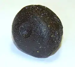 An Indochinite is a type of tektite. Tektites were ejected into the Earth's upper atmosphere by a meteorite impact and subsequently cooled to form the distinctive glass-like structure. Indochinites are distinctly dark black in contrast to the green of European moldavite tektites. It is estimated that these bodies of solidified magma are 700,000 years old.[1] Indochinite tektites, as the name suggests, are found in the Indochinese peninsula, from Australia and the Pacific islands of Micronesia in the east and south, to China and Indonesia in the north and west. The largest indochinite is a Muong-Nong type tektite (which are layered tektites), which had a mass of 29.0 kg.