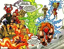 Although the Juggernaut resisted Cytorrak's evil influence (Iron Man speculated that the process that gave him his powers had been interrupted) and eventually switched to the side of good, the other Exemplars did not, each of them determined to continue their respective entity's vendetta against the others. Having come together after the explosion, they tracked Juggernaut to New York, declared him a traitor, and captured him, planning on executing him for his crimes against the Octessense. At the last moment, Juggernaut was rescued by the combined force of the Avengers, the team consisting of Captain America, Iron Man, Thor, Wonder Man, the Scarlet Witch, Firestar, Justice, the Wasp, and Giant-Man, while being aided by Quicksilver, Hercules, Spider-Man, and Nova. The Exemplars managed to defeat all of the heroes except for Captain America, who made Bedlam realize that she and the other Exemplars had had significant psychological alterations made by the entities that gave them their powers. Bedlam used her psychic powers to broadcast her realization to the other Exemplars, clearing their minds of the evil mystical influence and leaving them with their original personalities but retaining their powers. After that, they departed until they could figure out what to do next and have not been seen since.