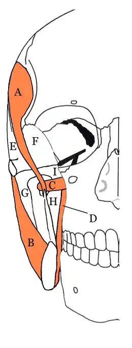 The infratemporal space is the inferior portion of the deep temporal space, which is one of the four compartments of the masticator space, along with the pterygomandibular space, the submasseteric space and the superficial temporal space.[2] The deep temporal space is separated from the pterygomandibular space by the lateral pterygoid muscle inferiorly and from the superficial temporal space by the temporalis muscle laterally. The deep temporal space and the superficial temporal space together make up the temporal spaces.[3]