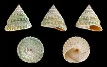 The name Trochus, according to P. Fischer[2] was used for the first time by Guillaume Rondelet, in 1558, who assembled under this title a rather miscellaneous assortment of univalves. Linnaeus' genus Trochus is composed principally of true Trochidae, but it is now viewed as having contained species of several other very different families.
