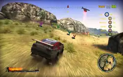 There are as many as ten game variations, most of which return from the original Insane. Besides traditional off-road racing, they are Capture the Flag, Gate Hunt, Jamboree, Pathfinder, and Return the Flag. The remaining four are new to the series: Greed, Pursuit, Knockout, and Zone Patrol.[2] In Capture the Flag, racers score points by carrying a flag by picking it up from the ground or stealing it from the racer carrying it,[2] scoring extra points by carrying it to the active checkpoint.[7] In Gate Hunt, players attempt to deactivate as many gates as possible before their opponents.[3][6] Jamboree is another gate-based mode where one gate is active until a player crosses it, awarding them a point and activating another at random.[3][7] A few gates are lit in yellow to indicate which one will activate next. In Pathfinder, players seek to become the first to cross all gates.[3] Return the Flag is another flag-based mode wherein a flag is placed at random points of the map[8] and players return it to the base before others do.[2] As for the new game modes, in Greed, packages colored gold, silver, and bronze are parachuted from the sky, and a certain number of points are awarded to whoever collects them, with gold being worth the most and bronze the least.[5] Pursuit involves a helicopter traveling above the playing field and beaming down a cone of light in which racers strive to remain the longest.[3][6] Knockout is an elimination race game where the racer in last place drops out after an amount of time, usually 15 to 30 seconds, and the process repeats until only one player is left.[9] Zone Patrol is a new variation of Gate Hunt where one can pass gates claimed by an opponent and "recolor" it,[2] diverting their point to one's score.[3]