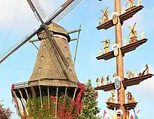 On the square is the "international mill tree". This is a pole, about 30 metres high, on which the state coats-of-arms of all the countries represented by the mills in the museum may be found, as well as wood carvings with milling motifs.