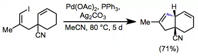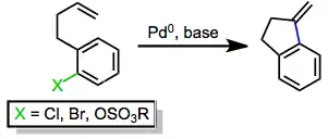 The Heck reaction is the palladium-catalyzed coupling of an aryl or alkenyl halide with an alkene to form a substituted alkene.[2] Intramolecular variants of the reaction may be used to generate cyclic products containing endo or exo double bonds. Ring sizes produced by the intramolecular Heck reaction range from four to twenty-seven atoms. Additionally, in the presence of a chiral palladium catalyst, the intramolecular Heck reaction may be used to establish tertiary or quaternary stereocenters with high enantioselectivity.[3] A number of tandem reactions, in which the intermediate alkylpalladium complex is intercepted either intra- or intermolecularly before β-hydride elimination, have also been developed.[4]