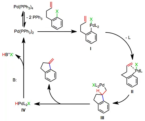 Insertion takes place in a suprafacial fashion, but the dihedral angle between the alkene and palladium-carbon bond during insertion can vary from 0° to ~90°. After insertion, β-hydride elimination affords the product and a palladium(II)-hydrido complex IV, which is reduced by base back to palladium(0).[5]