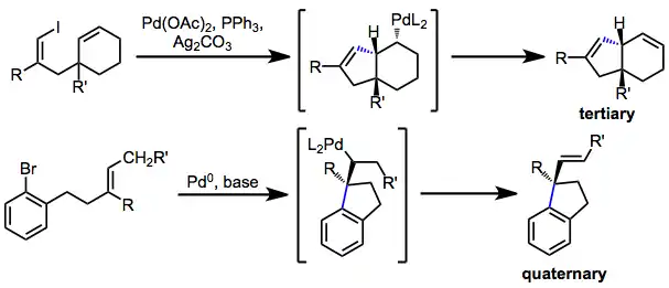 Asymmetric Heck reactions establish quaternary or tertiary stereocenters. If migratory insertion generates a quaternary center adjacent to the palladium-carbon bond (as in reactions of trisubstituted or 1,1-disubstituted alkenes), β-hydride elimination toward that center is not possible and it is retained in the product.[3] Similarly, β-hydride elimination is not possible if a hydrogen syn to the palladium-carbon bond is not available. Thus, tertiary stereocenters can be established in conformationally restricted systems.[10]