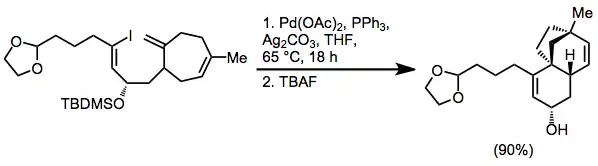The high functional group tolerance of the intramolecular Heck reaction allows it to be used at a very late stage in synthetic routes. In a synthesis of (±)-FR900482, IMHR establishes a tricyclic ring system in high yield without disturbing any of the sensitive functionality nearby.[18]
