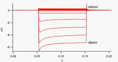 Inward rectifiers also differ from tandem pore domain potassium channels, which are largely responsible for "leak" K+ currents.[9] Some inward rectifiers, termed "weak inward rectifiers", carry measurable outward K+ currents at voltages positive to the K+ reversal potential (corresponding to, but larger than, the small currents above the 0 nA line in figure 1). They, along with the "leak" channels, establish the resting membrane potential of the cell. Other inwardly rectifying channels, termed "strong inward rectifiers," carry very little outward current at all, and are mainly active at voltages negative to the K+ reversal potential, where they carry inward current (the much larger currents below the 0 nA line in figure 1).[10]