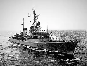 She was laid down on 24 April 1952 and launched on 9 August 1955 by Cantiere navale fratelli Orlando. Commissioned on 23 February 1958 with the hull number D 559 and decommissioned in November 1980.[1]