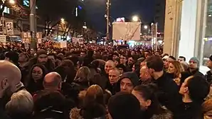 On Friday 2 March, up to 25,000 people gathered in Bratislava to commemorate the murdered couple.[25] On 9 March, protests were held in 48 towns and cities in Slovakia as well as 17 other cities around the world. In Bratislava alone, about 60,000 people held a protest march, the biggest turnout of any demonstration since the Velvet Revolution in 1989.[26] The protests were endorsed by several universities in Slovakia and the Czech Republic, teachers, school associations, artists and non-governmental organizations. 21 universities cancelled afternoon lectures to allow students and employees to attend the protests.[27]