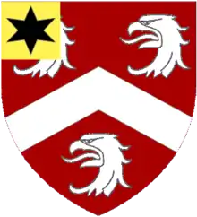 Gules a chevron between three eagles' heads erased Argent langued Azure on a canton Or a star of six points Sable.