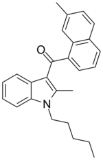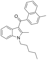 - 1 2 3 4 5 6 7 8 9 10 11 12 13 14 15 16 17 18 19 20 21 22 23 24 Aung MM, Griffin G, Huffman JW, Wu M, Keel C, Yang B, Showalter VM, Abood ME, Martin BR (August 2000). "Influence of the N-1 alkyl chain length of cannabimimetic indoles upon CB(1) and CB(2) receptor binding". Drug and Alcohol Dependence. 60 (2): 133–40. doi:10.1016/S0376-8716(99)00152-0. PMID 10940540.