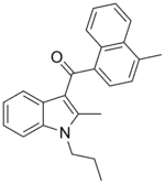- 1 2 3 4 5 6 7 Wiley JL, Smith VJ, Chen J, Martin BR, Huffman JW (2012). "Synthesis and pharmacology of 1-alkyl-3-(1-naphthoyl)indoles: Steric and electronic effects of 4- and 8-halogenated naphthoyl substituents". Bioorganic & Medicinal Chemistry. 20 (6): 2067–2081. doi:10.1016/j.bmc.2012.01.038. PMC 3298571. PMID 22341572.