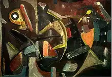 Mancino's work in abstract expressionism and suprematism is mainly based on artworks of earlier abstract expressionists from the early and middle of the 20th century. His earliest work comprised classical landscapes and still life compositions but his later work focused on the art theories of abstract painters like Wassily Kandinsky, Mark Rothko and Jackson Pollock.[1] The change helped him establish his own artistic style within abstract expressionism. Since then he has followed the New York School of abstract expressionism . The technical elements of his art theory show the balanced application of either precise or raw objects relations. The communicative compositions are systemically related with impulsive color surroundings; the artistic application of his works are also characterized by strong vibrant colorization and raw geometrical shape composition or structuring. The use of geometrical shapes reflect Suprematism, although he preferred to call his style "Fragmented Geometrical Abstract."