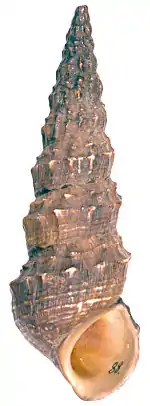 The shell of an adult Jagora asperata can be as long as 50–80 millimetres (2.0–3.1 in) and has a width of about 18 millimetres (0.71 in). This shell is solid, dark brown to yellowish brown, highly tower–shaped, comprising up to twelve whorls. The apical whorl is truncated. The sculpture of the shell shows closely spaced axial ribs and spiral elements with tiny nodules.