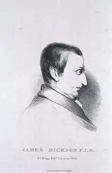 Dickson in 1788 became one of the original members of the Linnean Society, and in 1804 was one of the eight original members and a vice-president of the Horticultural Society. He died at Broad Green, Croydon, Surrey, on 14 August 1822, his wife, a son, and two daughters surviving him. His portrait by Henry Perronet Briggs (1820) was lithographed.[2]