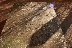 Findlater died in 1811 and he bequeathed the Dresden property to Fischer who lived at Helfenberg Manor until his own death in 1860.[11] The Scottish heirs protested in court on the ground that the bequests to Fischer had been made for an immoral consideration (i.e. "ob turpem causa").[12] Also upon his death, the earldom of Findlater became dormant. The title of Earl of Seafield passed to his cousin Sir Ludovick Alexander Grant (1767–1840) who also took the surname Ogilvy. Findlater is buried at the Loschwitz parish church. The gravestone includes both Findlater and his partner Johann Georg Christian Fischer (1773–1860).