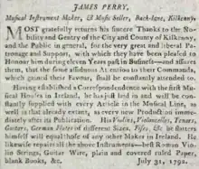 JAMES PERRY, Brother to Thomas Perry, of Anglesea-street, Dublin, now resides in Back-lane, Kilkenny, where he makes and repairs Violins, Guitars, and Tenors, in the best and cheapest Manner ; and hopes to merit the Favour and Protection of his Friends and the Public by the strictest Attention to their Commands.