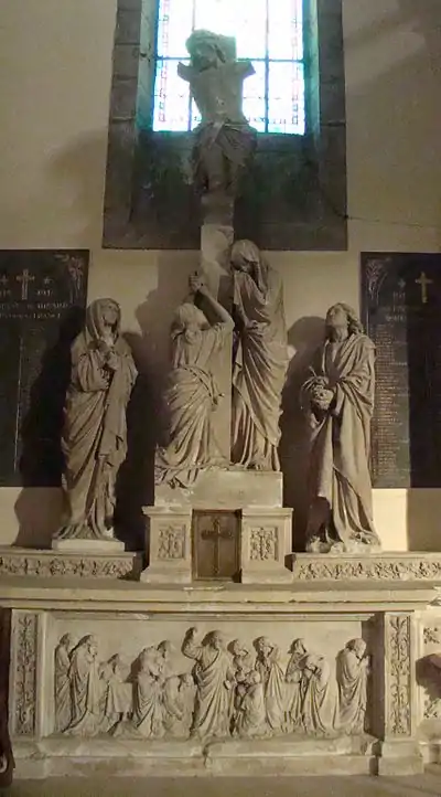For this church in Montreuil-le-Gast, Valentin executed a limestone altarpiece for the main altar. It comprised a cavalry with angels placed on either side. The work dates to 1861.[8][9] [10] For the same church, Valentin created the altarpiece for the main altar.[11]