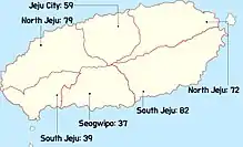 - South part of Jeju (Hangul: 남제주군) : 121 (Daejeong Town 8, Namwon Town 29, Seongsan Town 22, Andeok-myeon 31, Pyoseon-myeon 31)