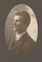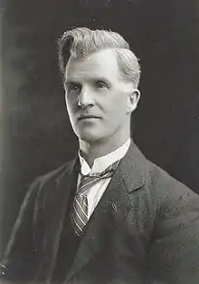 In 1910 Scullin won his first election as the Labor candidate in Corangamite, in a year when Labor's Andrew Fisher surged in the polls and formed Australia's first majority government.[16] Scullin had done much to personally build the grass-roots organisation of the Labor movement in this seat in the years prior to the election, although its rural character meant it was not considered a seat naturally sympathetic to Labor.[17] His campaign focused on increasing the powers of the Federal parliament and issues such as defending a white Australia, higher import duties and the introduction of a land tax.[17] In federal parliament, Scullin quickly earned a reputation as an impressive and formidable parliamentary debater. He spoke on a wide range of issues over the three years of his term, but concentrated especially on matters relating to taxation and the powers of the Commonwealth, both of which would become signature issues for Scullin throughout his career.[8] By the end of his first year in parliament he had a reputation as "one of the most ardent land-taxers in the Labor party"[18] and had spoken frequently on breaking up "the land monopoly which has for so many years retarded the growth of this young country."[19] Scullin enthusiastically supported Fisher's referendum questions in expand Commonwealth power over in 1911 and again in 1913, though in both cases all amendment proposals were rejected by comfortable majorities.[20] Although he was well regarded in his district and hard-working and ardent, it was not enough to shield him from Joseph Cook's resurgent and now united Commonwealth Liberal Party in the election of 1913, and Scullin suffered the fate of many Labor members in rural districts at that year's election.[21] He tried and failed to reacquire the seat at the 1918 Corangamite by-election.