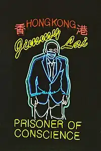 - ↑ "Exhibition of neon art - "Jimmy Lai in chains"".