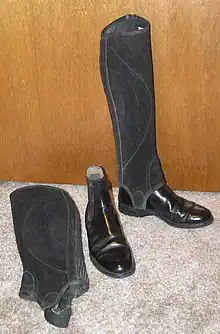 The word "jodhpurs" is often used interchangeably with riding breeches, though this is technically incorrect. Breeches are riding pants that come down to about mid-calf, and are designed to be worn with long stockings and tall boots. Jodhpurs are ankle length and are worn with short, ankle-high Jodhpur boots, also known as paddock boots. Sometimes knee-length half-chaps or leggings may be added.[2]