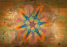 Joe Mangrum has created hundreds of sand paintings in public spaces of New York City. Each large scale sand painting is spontaneously created by pouring colored sand into multiple patterns over the course of a day and is often fifteen to twenty feet in diameter. He cites influences from many sources in what he calls, “...organic symmetry where the feeling of the design is of a living being outstretched on the pavement...images may intertwine like a Celtic knot or represent nature like a sea anemone, DNA strands or some biomorphic form, sometimes very psychedelic.”[3] He also describes "... an urban free-style and combined with bright 'Pop Art' colors, fractal variations and circuitry. My paintings are influenced by an abundant world of undersea creatures, carnivorous plants emanating electrical impulses, a living mathematical amalgam and botanical geometry stemming cross-cultural metaphors..." He also cites influences such as Rangoli, Buddhist mandalas, Navajo sand paintings, mosaics in Islamic art and the rose windows of European cathedrals.[4][5]