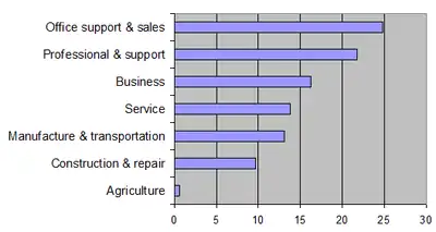 Overall, those employed in office administrative and support, service and sales occupations constituted 38.6% of the labor force. Those employed in business and professional as well as professional support occupations (e.g. nurses) made up 38.0% of the labor force. Combined white collar employees including service workers such as restaurant serves and hotel maids constituted 76.6% of the labor force. If service workers are excluded 62.8% were employed in white collar occupations.