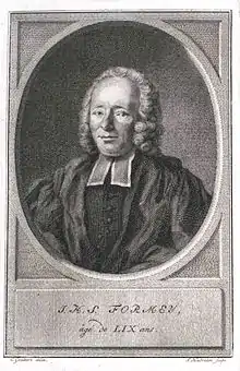 Johann Heinrich Samuel Formey (French: Jean Henri Samuel Formey; 31 May 1711 – 7 March 1797) was a German churchman, educator, author, and journalist. The son of an immigrant French family, he preached, taught, and wrote in French. A founding member of the Berlin Academy, he wrote thousands of letters, popularized scientific and philosophical ideas, and also contributed to Diderot's Encyclopédie.[1]