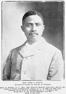 With the support of Booker T. Washington, he was appointed collector of customs at Wilmington, North Carolina, in 1897, serving the position under presidents Harrison and McKinley.[4] That year, he was also involved in the founding of Coleman Manufacturing Company, the first cotton mill in the United States owned and operated by African Americans[5] In 1898, Dancy was a part of the founding of the National Afro-American Council, formed after the collapse of the National Afro-American League. T. Thomas Fortune was initially elected president, but he declined the position and Alexander Walters was selected. Dancy was elected Vice-President, Ida B. Wells secretary, and John W. Thompson treasurer. Washington was also a primary player in the group.[6] Tensions rose in Wilmington during this period, and Dancy's position on an organization in opposition to legislation which prevented interracial marriages increased the tension. Tension came to a head in November with the Wilmington massacre of 1898, during which thousands of the city's African Americans were attacked, and Dancy was forced to flee the city.[7] Dancy then was appointed to the position of recorder of deeds from 1901 to 1910.[4] His home in Washington became a center of Southern black society in the nation's capital.[8]