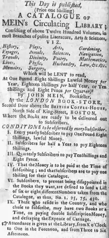 Mein then opened his own bookstore that he named The London Bookstore, and began the first circulating library in Boston.[4][5] His catalog advertised twelve hundred books, and he offered various payment schedules: "One Pound, Eight Shillings, lawful Mondey, per Year; Eighteen Shillings per Half-Year; or Ten and Eight Pence per Quarter." He sold the catalog for a shilling, and restricted loans to one book at a time.[6] The library collection included works of history, literature, travel, law, medicine, and the like, in English and French, by authors such as: