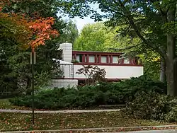 The John S. Whitman House is constructed as three long and narrow rectangular blocks, stacked atop of the other. The overall look is strongly horizontal, balanced with vertical lines from the embossed chimney, a patio window and bay windows on one side. The entrance is within a small, recessed door near the garage.[2]