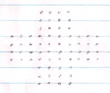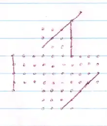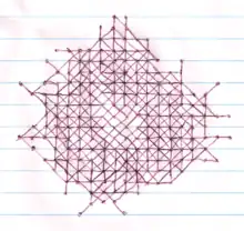 For the "touching" version of the game with lines consisting of 5 marked points, the present record of 178 lines was established on 2011 August 12, using a Monte-Carlo search by algorithmist Christopher Rosin.[5][6] This is eight moves more than the previous 1976 record of 170 lines.[3][5][7] The 1976 record was done by hand, and computer searches had not been able to approach this record[7] despite substantial progress,[8] until August 2010 when Christopher Rosin used a Monte-Carlo search to obtain a result of 172 moves, exceeding the 1976 record, and 178 moves one year later.[6]