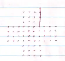 Join five (also known as morpion solitaire, cross 'n' lines or line game) is a paper and pencil game for one or two players, played on a plus-shaped grid of dots. The origins of the game are probably in northern Europe. References to the game first appeared in French publications in the 1970s.[1] In addition to being played recreationally, the game has been the subject of theoretical studies[2] and computer searches for solutions.[3]