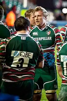 In the Heineken Cup semi-final match against Cardiff Blues on 3 May 2009, Crane scored the winning kick in the penalty shootout after the game had finished level after extra time.[7] It was the first time a Heineken Cup tie had been decided in a shootout. Crane started in the subsequent 2009 Heineken Cup Final.[8] Crane scored the only try in the final of the 2008–09 Guinness Premiership as Leicester defeated London Irish.[9] He also started as Leicester won the 2010 and 2013 Premiership finals.[10][11] Crane spent the whole of the 2011–12 Aviva Premiership campaign injured.