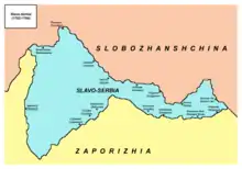 Šević was among the Serbian military officers who led about 3,000 Serb families that emigrated to the region along river Donets.[19] The group led by Šević was the second group of Serb emigrants to the Russian Empire. The first group settled the region which was referred to as New Serbia for some time. The second group, led by Šević, settled the territory which they named Slavo-Serbia.[20] This name was initially proposed by Šević.[21] They left Pomorišje in September 1752 and reached Kiev in December 1752. There, they were instructed to settle New Serbia governed by Jovan Horvat. They refused to do so and Šević accompanied by Rajko Preradović, a Colonel of the Slavonian Hussar Regiment, went to St. Petersburg where they submitted an application to the Governing Senate to allow them to settle another territory, separated from New Serbia. On 17 May 1753, Russian empress Elizabeth signed a decision to allow colonists from Pomorišje led by Šević to populate the territory between Bakhmut and Luhansk.[22] The New Serbia was established and populated by Serb colonists, while colonists to the Slavo-Serbia, besides the Serb majority, include people of other ethnicity, such as Bulgarians, Aromanians, Vlachs and Greeks.[23] Horvat tried to convince people brought by Šević to Slavo-Serbia to move to his New Serbia, but his attempts failed and only a small number of people moved using small boats to float downstream on the Dnieper.[24]