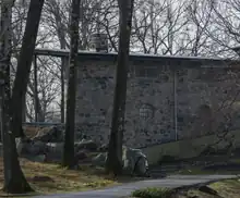 The Street family considered Harrison a skyscraper architect, so his decision to both plan and supervise the construction of their house in Scarborough, a hamlet of the village of Briarcliff Manor, surprised them.[12] By October 6, 1937, the house that Harrison constructed had one story of stone in the shape of an L, with a short stone wall extending from the back of the house, and a ramp path with a serpentine wall running up along the front of the house to the entrance.[11] By March 7, 1938, the two-story house was completed.[13] The finished house was built of local fieldstone in the shape of an L, using steel beams on the roofs of the house and garage, with sixteen-inch walls,[14] glass porthole windows, and large panes of glass and doors on the back of the house—it was related in design to other early Modernist houses constructed in the late 1930s by the Modernists Walter Gropius and Marcel Breuer.[12] Breuer was a proponent of the more modern International Style,[15] and Gropius, as Director of the Bauhaus in Germany, applied the International Style when he designed the school's faculty housing and building around 1925 to 1926.[16] Gropius and Breuer represented a new form of architectural design, one that did not look to the past, but rather to modern industry for inspiration.