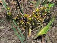 The large inflorescence has many clusters of up to 70 flowers each. The flower has very narrow green, red, or yellow-brown, lance-shaped tepals and six stamens with very small anthers. The fruit is a brown oblong capsule. This plant does not require fertilizer. Also, this plant is a rhizomatous perennial herb producing erect stems to a maximum height between about 40 and 80 centimeters. It has wide leaf blades for a rush, often exceeding one centimeter in width at the base. The few straw-colored leaves reach up to 40 to 80 centimeters in length. This plant grows low to the ground and spreads over the land. [1]