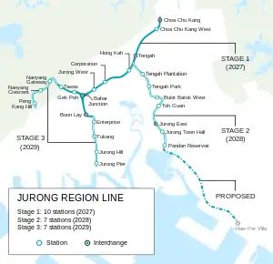 The Jurong Region Line (JRL) is a future Mass Rapid Transit (MRT) line that will serve the western part of Singapore. The JRL was first announced in 2013, and is set to open in stages from 2027 to 2029.[1][2] The JRL will have 24 stations, serving Choa Chu Kang in the north, Jurong Pier in the south, Peng Kang Hill in the west and Pandan Reservoir in the east. An extension to Haw Par Villa station is under consideration. The line is coloured teal on the rail map.